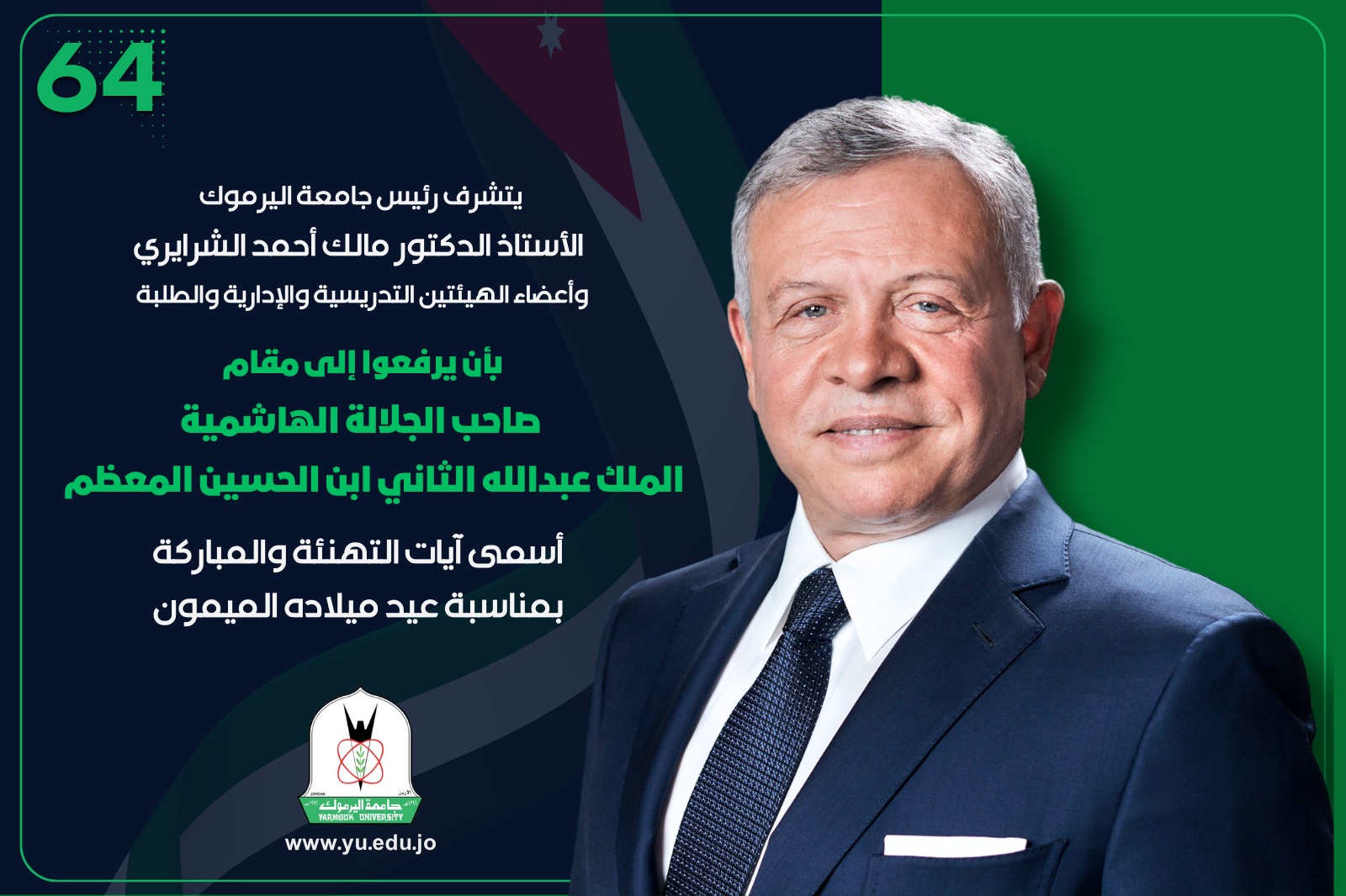 "اليرموك" تهنئ قائد الوطن بعيد ميلاده الميمون الـ 64